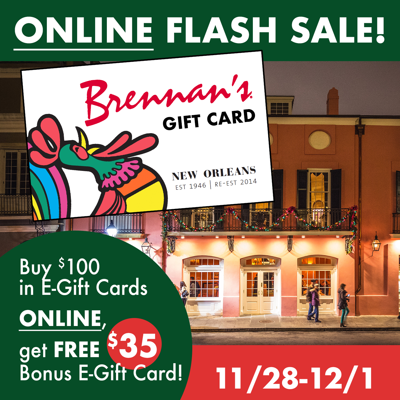 Brennan's Restaurant is a New Orleans restaurant tradition since 1946. Our innovative Creole menu borrows influences from French and Spanish ancestry with modern updates and distinct seasonal offerings. Old-world elegance inspired dining rooms, and personable, attentive service, create a unique and sophisticated experience.